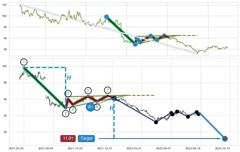 ➣ 缠论买卖点:下降缠中枢AB形成后猜想拐点1买已到达,猜想后续持续拉升(均值回复)