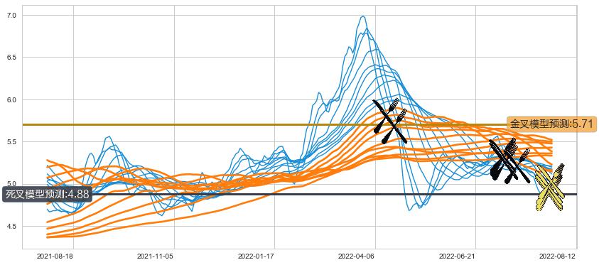 ➣ 34小时均线于(2022-07-08: 5.33)形成【死叉】基于【死叉历史模型】预测死叉后最低波谷价格: 5.02, 死叉后最低价格4.76,已经下跌超出预测最低波谷价格, 预期反弹