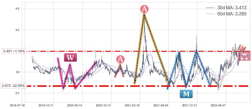 ♘ 支撑价格位2.672,可信任强度99.00%,距离最后交易2022-08-12形成的收盘价格3.450相差 -22.55%