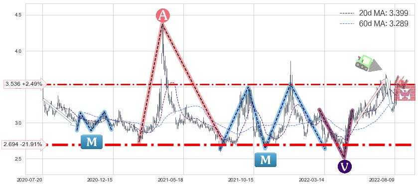 ♘ 支撑价格位3.536,可信任强度55.83%,距离最后交易2022-08-12形成的收盘价格3.450相差 +2.49%