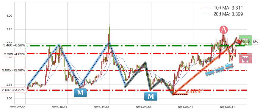 ♘ 阻力价格位3.460,可信任强度90.09%,距离最后交易2022-08-12形成的收盘价格3.450相差 +0.28%