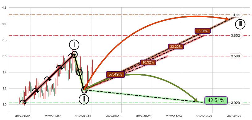 ➢ 【仅预测突破】最后价格:3.450与预测突破价格:3.028→【空间较大】后续最小【反转】第一目标价格→(2022-09-07: 2.672 )