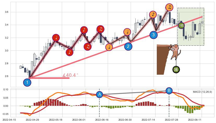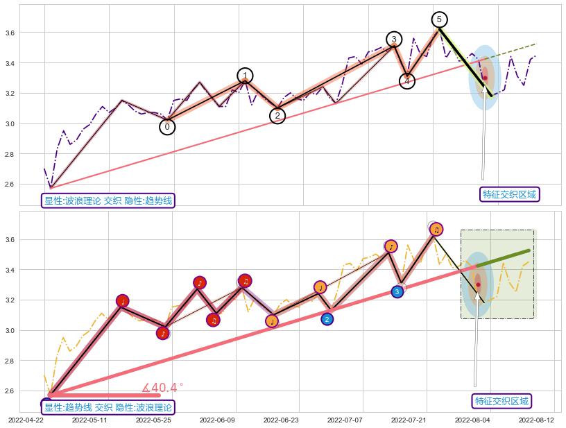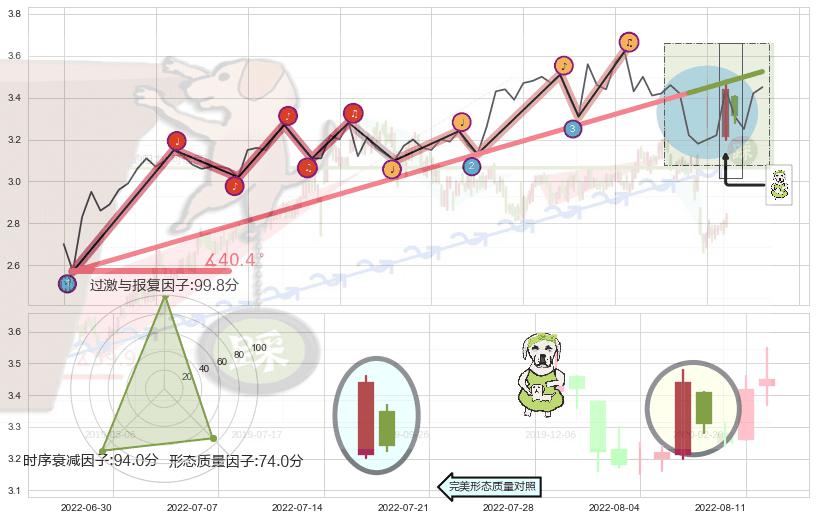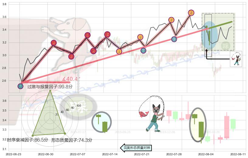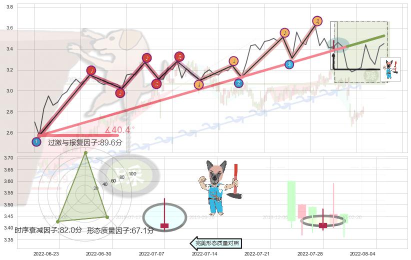 ➣ 2022-04-25-2022-08-02上升趋势存在反转[风险],虽然原上升趋势的支撑位(3.525)已破位,但其支撑效果尚存,原上升趋势角度: 40.4˚