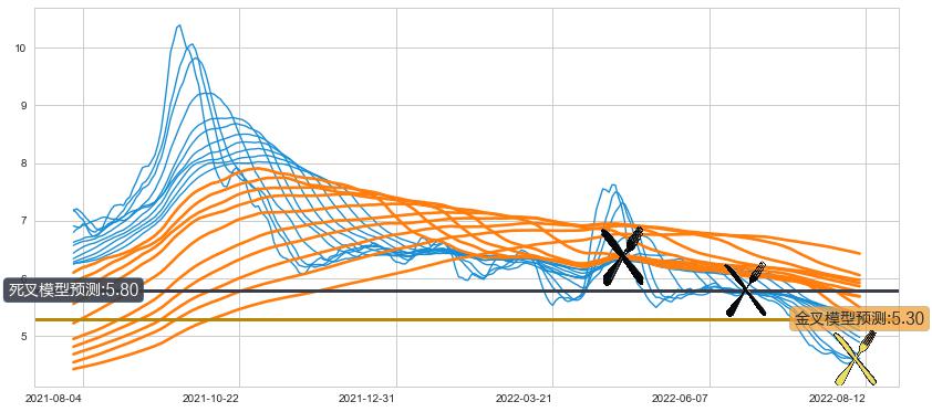 ➣ 60小时均线于(2022-04-22: 6.33)形成【死叉】基于【死叉历史模型】预测死叉后最低波谷价格: 5.90, 死叉后最低价格4.44,已经下跌超出预测最低波谷价格, 预期反弹