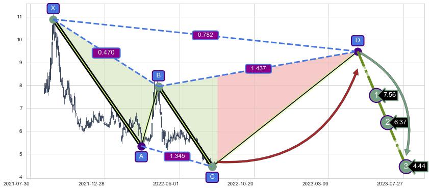 ➣ 谐波赛福:b持续蓄力下跌击穿越过c:猜想报复性拉升 → 上涨 →【拐点】强支撑临近 → 大趋势均值回复