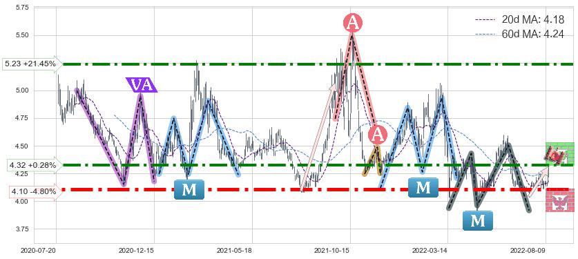 ♘ 阻力价格位4.32,可信任强度76.02%,距离最后交易2022-08-12形成的收盘价格4.31相差 +0.28%