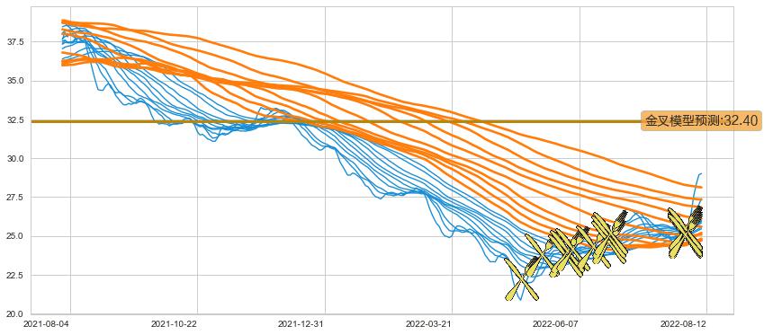 ➢ 120小时均线于(2022-08-03: 25.04)形成【金叉】基于【金叉历史模型】预测金叉后最高波峰价格: 33.62, 金叉后最高价格29.55,尚未达到预测最高波峰价格, 预期继续上涨