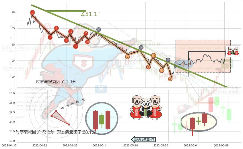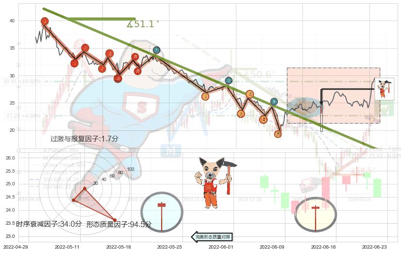 ➢ 2021-07-30-2022-05-20下跌趋势存在反转上涨[机会],其原下跌趋势的阻力位(16.38)已被突破[强支撑信号],原下跌趋势角度: 51.1˚