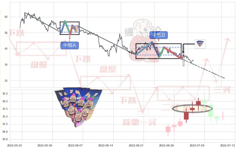 ➣ 【中枢B】:2021-11-29-2022-06-22,中枢由5笔构成,共136交易日, ZG=40.93, ZD=36.12