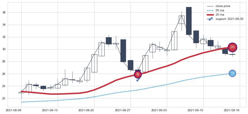 ➣ 34小时均线于(2022-08-10: 19.70)形成【金叉】基于【金叉历史模型】预测金叉后最高波峰价格: 24.33, 金叉后最高价格19.67,尚未达到预测最高波峰价格, 预期继续上涨