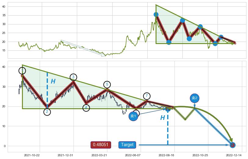 ➢ 下降三角整理:猜想临近关键支撑位突破点 → 临近拐点下跌 → 风险信号 → 大趋势均值回复