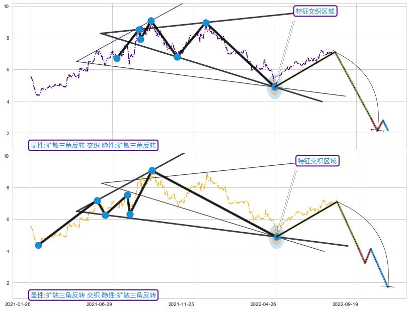 ➣ 扩散三角反转:猜想临近关键支撑位突破点 → 临近拐点下跌 → 风险信号 → 大趋势均值回复