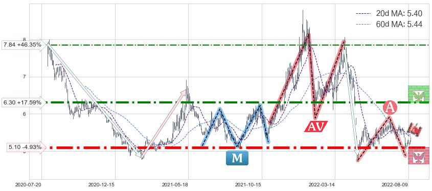 ♘ 阻力价格位7.84,可信任强度54.11%,距离最后交易2022-08-12形成的收盘价格5.36相差 +46.35%