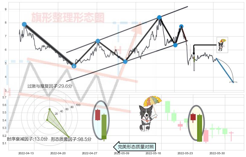 ➢ 下降三部曲(降势三鹤) 🔜 升旗形支撑破位转换阻力下跌 综合量化分数:41.94 【偏空】