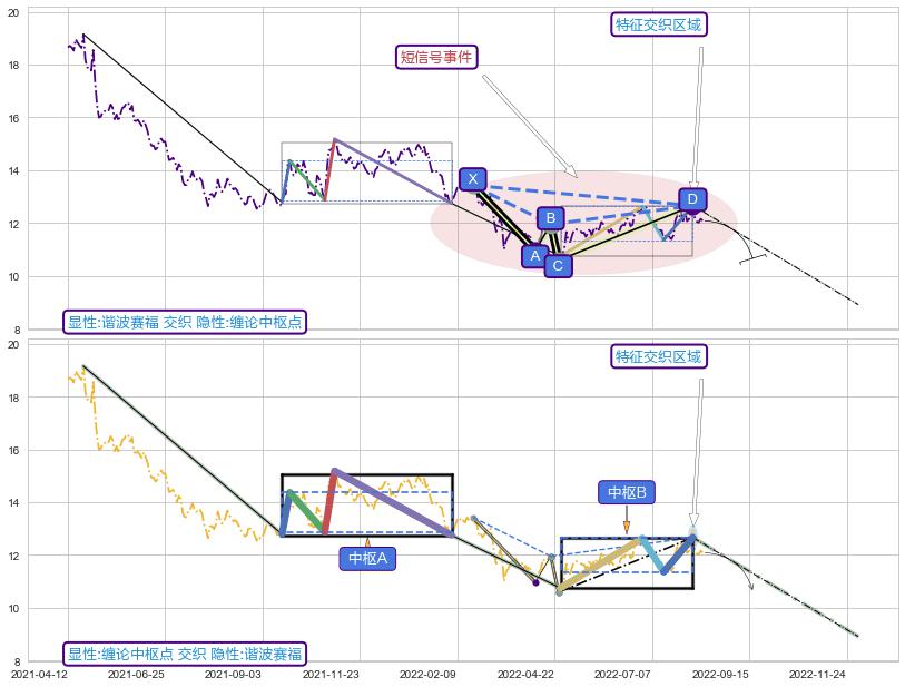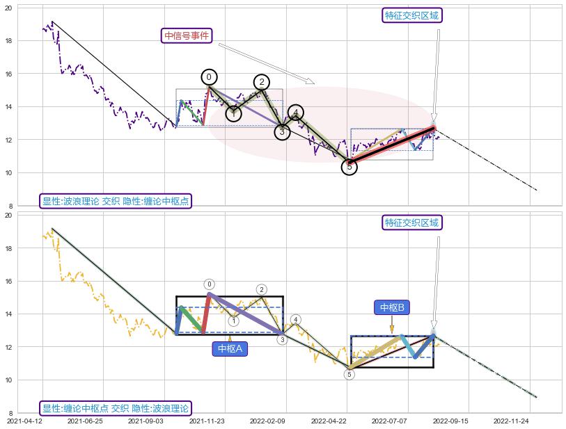 ➣ 缠论中枢点:猜想破位中枢B后持续下拉 → 下跌 → 破位中枢B支撑 → 持续趋势跟踪