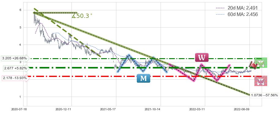 ♘ 阻力价格位2.677,可信任强度85.66%,距离最后交易2022-08-12形成的收盘价格2.530相差 +5.82%