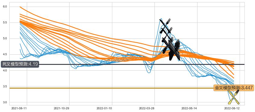 ➣ 34小时均线于(2022-04-20: 4.75)形成【死叉】基于【死叉历史模型】预测死叉后最低波谷价格: 4.38, 死叉后最低价格2.990,已经下跌超出预测最低波谷价格, 预期反弹