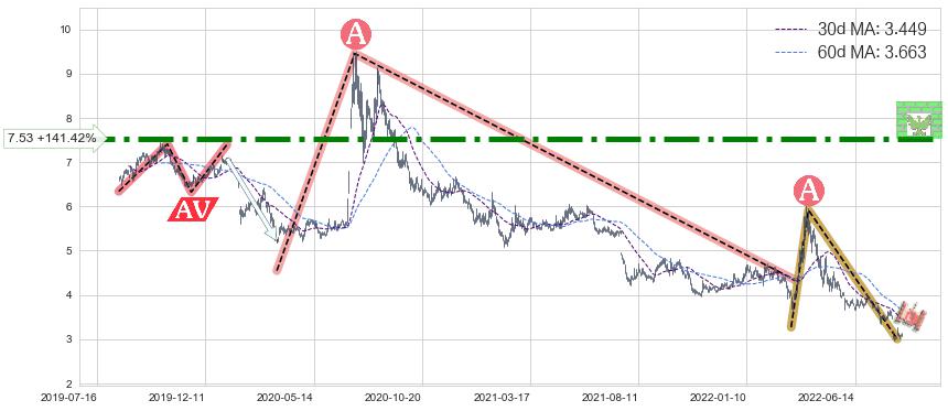 ♘ 阻力价格位7.53,可信任强度87.52%,距离最后交易2022-08-12形成的收盘价格3.120相差 +141.42%