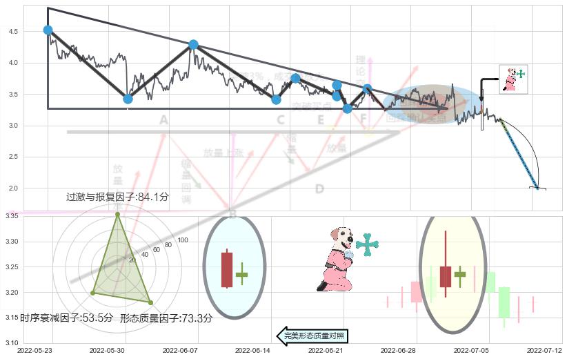 从2019-07-16至2022-07-12,共包含726个交易日,阶段股价下跌-28.20%,阶段股价变动位移路程比: 1 : 23,下跌趋势角度: 33.4,2020-02-03向↘︎形成缺口,跳空下跌-9.92%˚