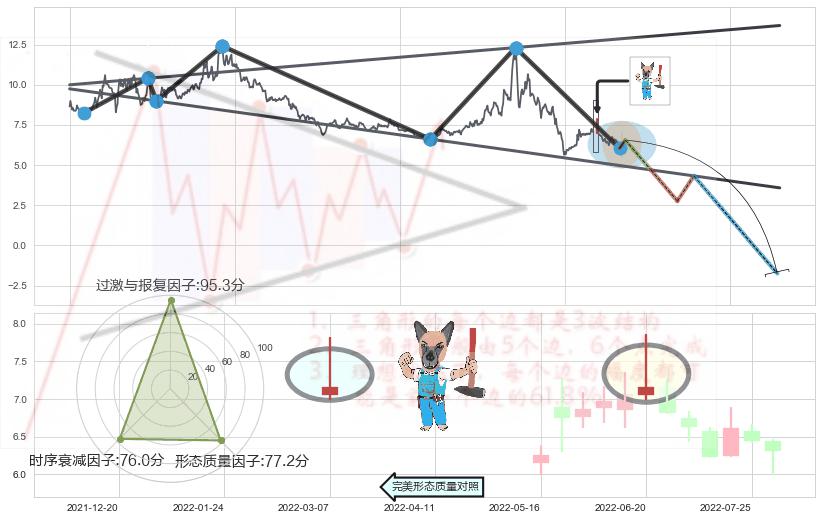 ➣ 顶部尽头线(下山虎) + 扩散三角反转临近支撑猜想转换阻力下跌信号叠加后【目标达成率】低,【看空】信号叠加【存续影响大】
