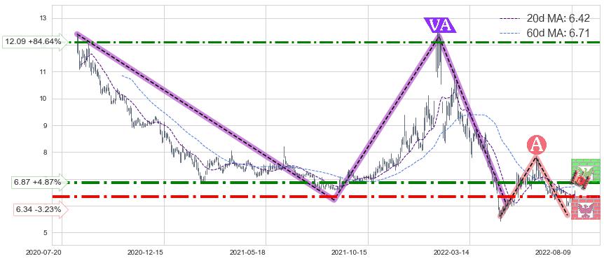 ♘ 阻力价格位6.87,可信任强度76.90%,距离最后交易2022-08-12形成的收盘价格6.55相差 +4.87%