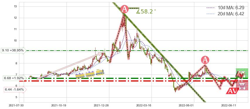 ♘ 阻力价格位9.10,可信任强度53.67%,距离最后交易2022-08-12形成的收盘价格6.55相差 +38.95%