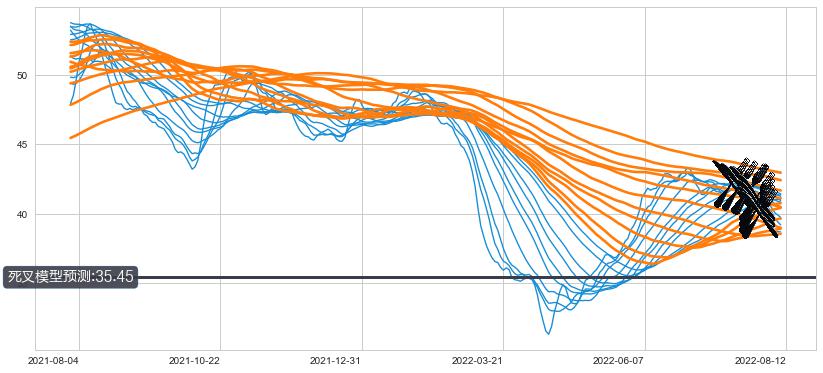 ➢ 10小时均线于(2022-07-28: 41.75)形成【死叉】基于【死叉历史模型】预测死叉后最低波谷价格: 39.46, 死叉后最低价格37.68,已经下跌超出预测最低波谷价格, 预期反弹