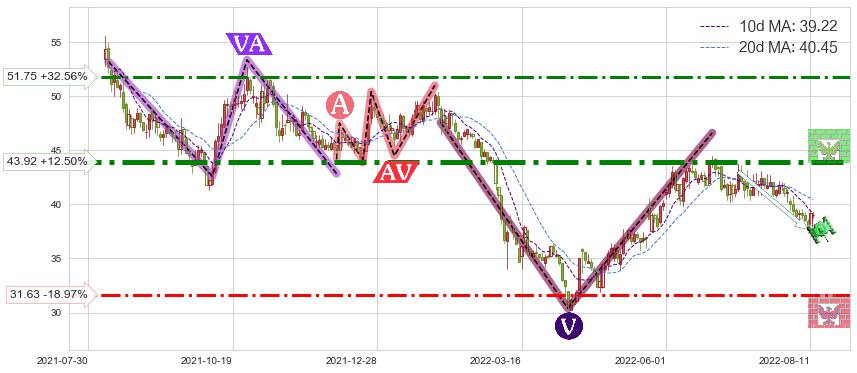 ♘ 阻力价格位43.92,可信任强度92.39%,距离最后交易2022-08-12形成的收盘价格39.04相差 +12.50%