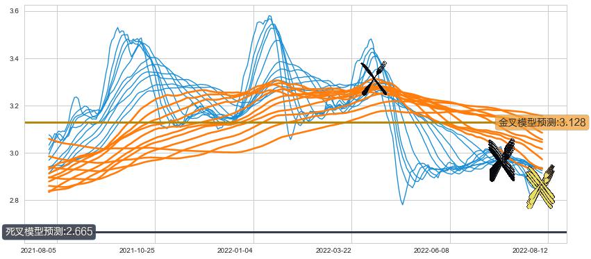 ➣ 45小时均线于(2022-07-14: 2.968)形成【死叉】基于【死叉历史模型】预测死叉后最低波谷价格: 2.632, 死叉后最低价格2.760,尚未达到预测最低波谷价格, 预期继续下跌