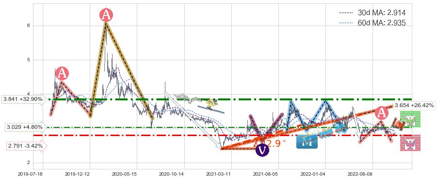 ♘ 阻力价格位3.029,可信任强度36.71%,距离最后交易2022-08-12形成的收盘价格2.890相差 +4.80%