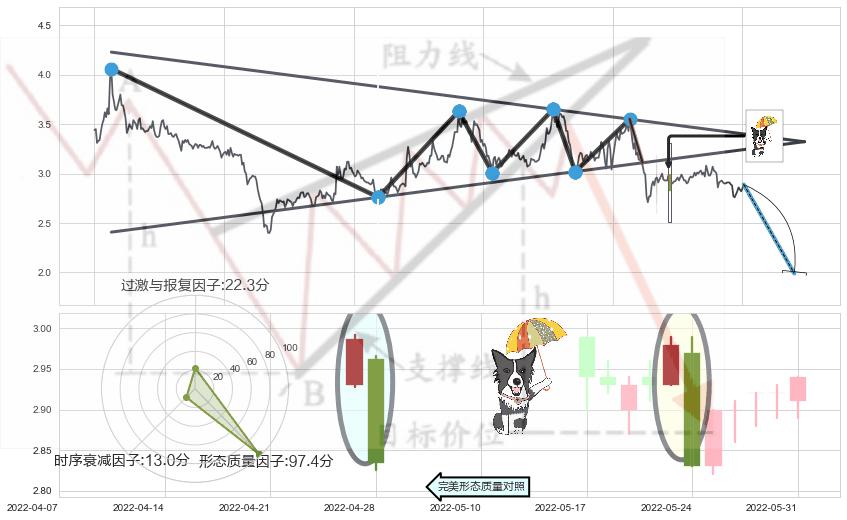 ➢ 【卖1】: 激进型 卖点→(2022-04-20: 3.109 )形成突破下降【对称】三角形整理【整理】形态