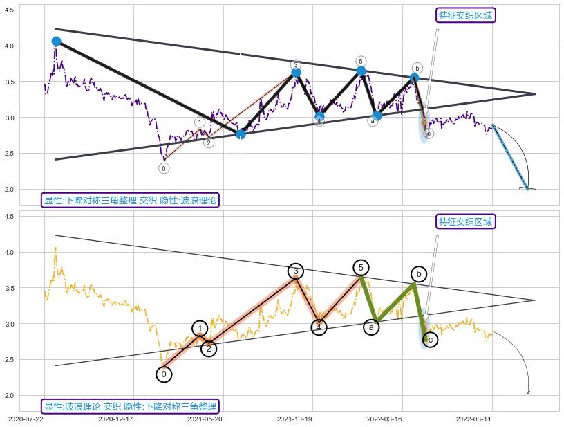 ➢ 下降对称三角整理与波浪理论信号事件周期长度级别相同,同周期信号事件