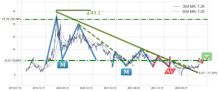 ♘ 阻力价格位8.23,可信任强度81.92%,距离最后交易2022-08-12形成的收盘价格7.58相差 +8.60%