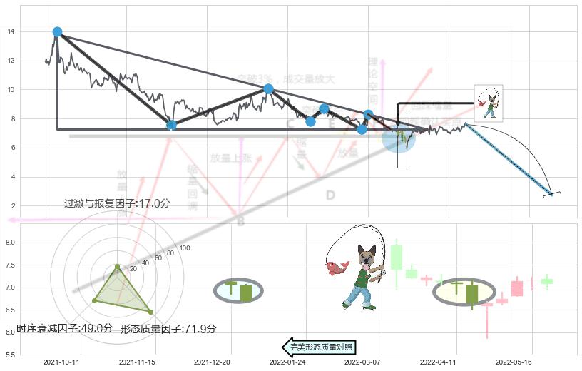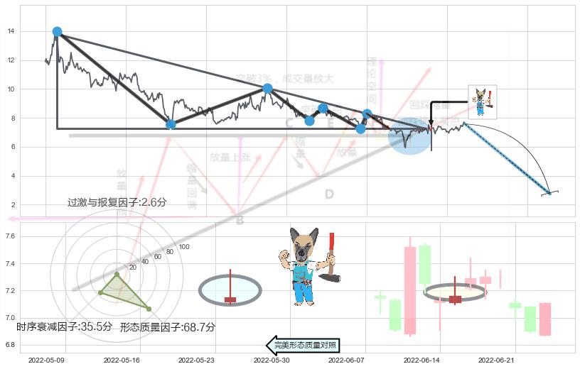➢ 【多方力量耗尽,空方打破攻守平衡点】下降三角形中继整理, 已在2022-03-25突破【支撑】颈线 7.25 →演变成下降通道