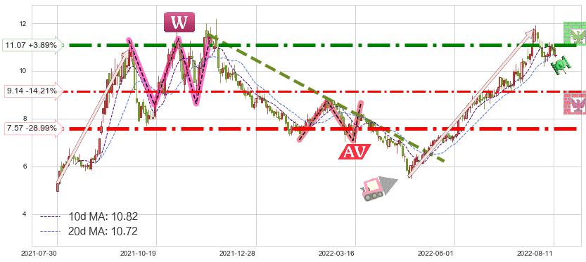 ♘ 阻力价格位11.07,可信任强度85.23%,距离最后交易2022-08-12形成的收盘价格10.66相差 +3.89%