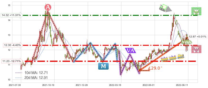 ♘ 支撑价格位11.23,可信任强度96.49%,距离最后交易2022-08-12形成的收盘价格12.87相差 -12.71%