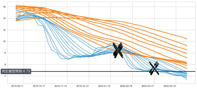 ➣ 40小时均线于(2020-01-20: 8.47)形成【死叉】基于【死叉历史模型】预测死叉后最低波谷价格: 6.48, 死叉后最低价格3.010,已经下跌超出预测最低波谷价格, 预期反弹