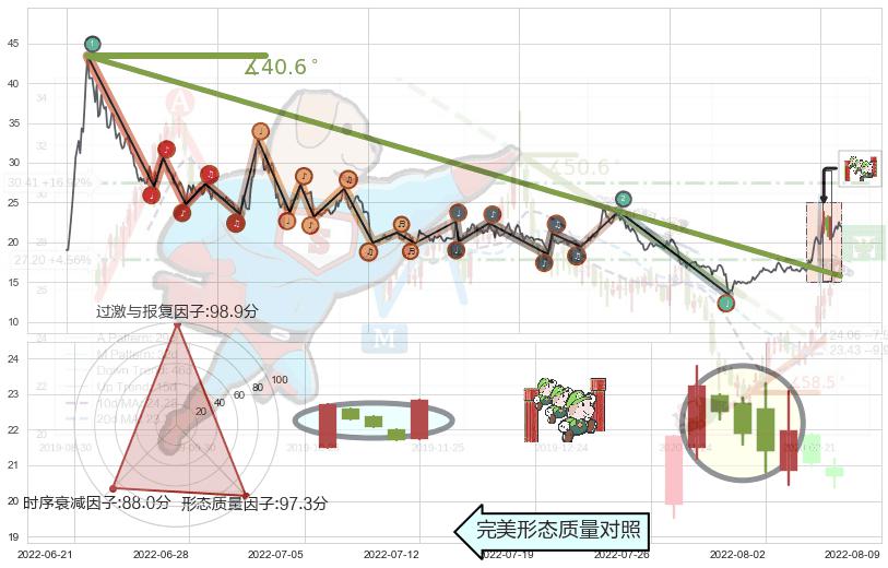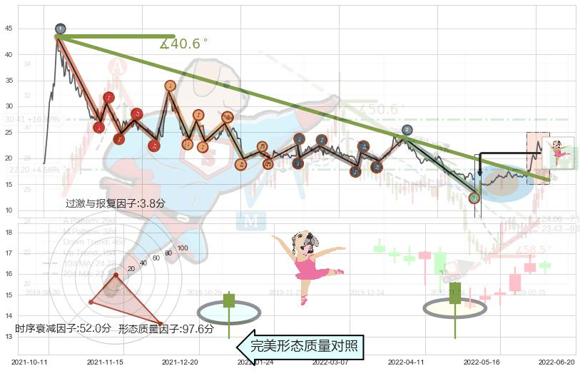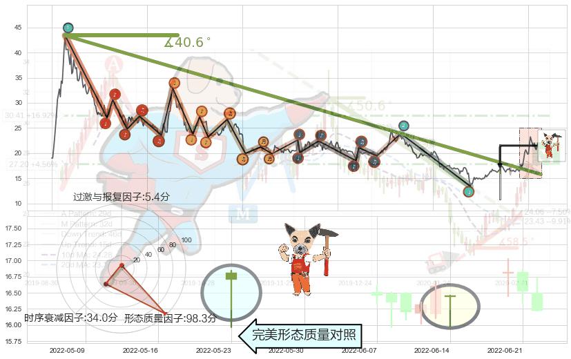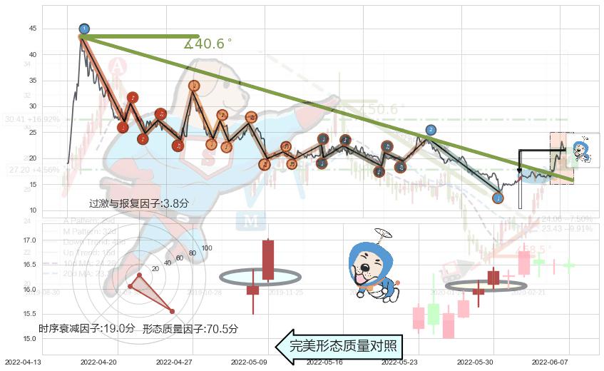 从2020-07-24至2022-06-15,共包含458个交易日,阶段股价下跌-76.05%,阶段股价变动位移路程比: 1 : 11,下跌趋势角度: 40.6