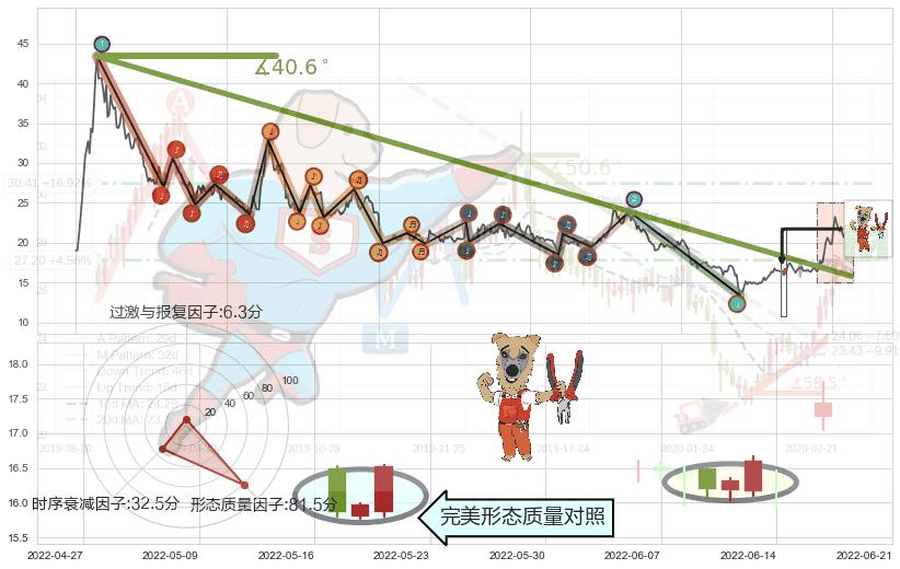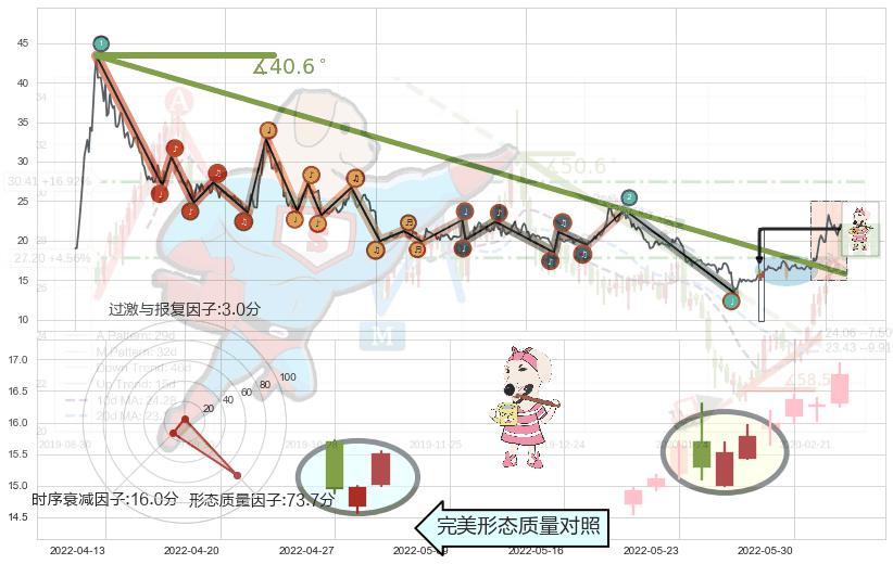➢ 2020-07-24-2022-06-15下跌趋势存在反转上涨[机会],其原下跌趋势的阻力位(15.77)已被突破[强支撑信号],原下跌趋势角度: 40.6˚