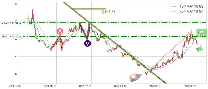 ♘ 阻力价格位24.54,可信任强度70.22%,距离最后交易2022-08-12形成的收盘价格18.22相差 +34.68%