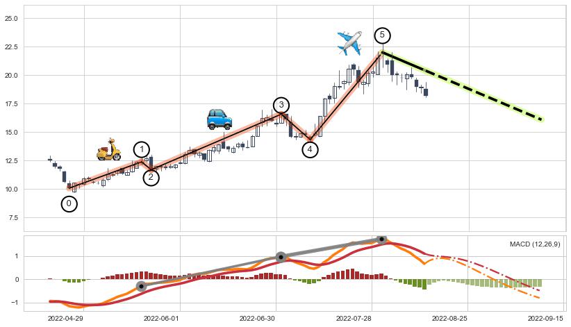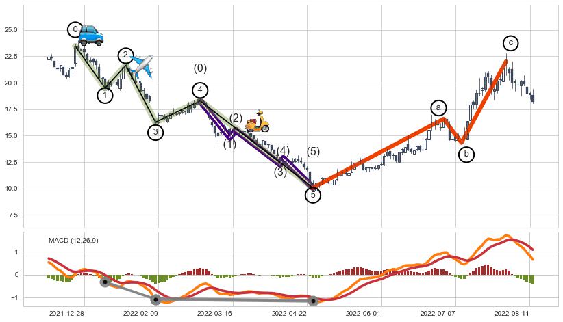 ➣ 波浪理论:猜想达到c点后小反弹终止反转下跌 → 下跌 → 【拐点】临近 → 阶段均值回复结束后继续大周期趋势跟踪
