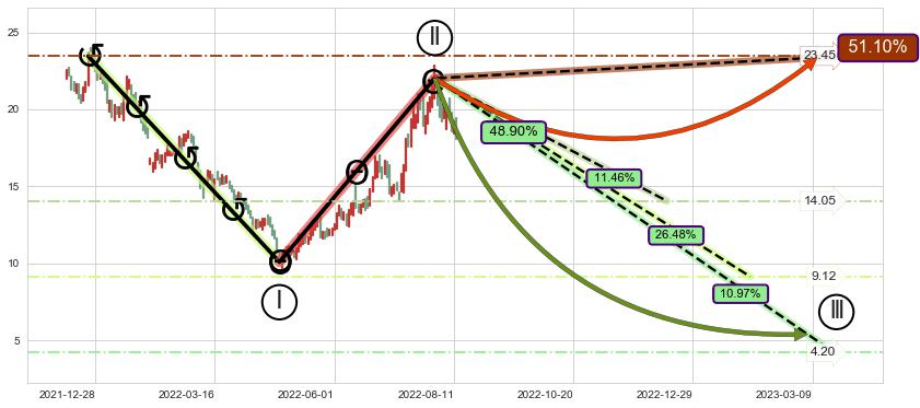 ➢ 循环浪继续向下【最高】位置(2022-12-14, 14.05),匹配聚类样本比例23.43%, 可能性概率11.46%