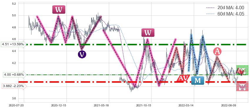 ♘ 支撑价格位3.882,可信任强度96.34%,距离最后交易2022-08-12形成的收盘价格3.970相差 -2.23%