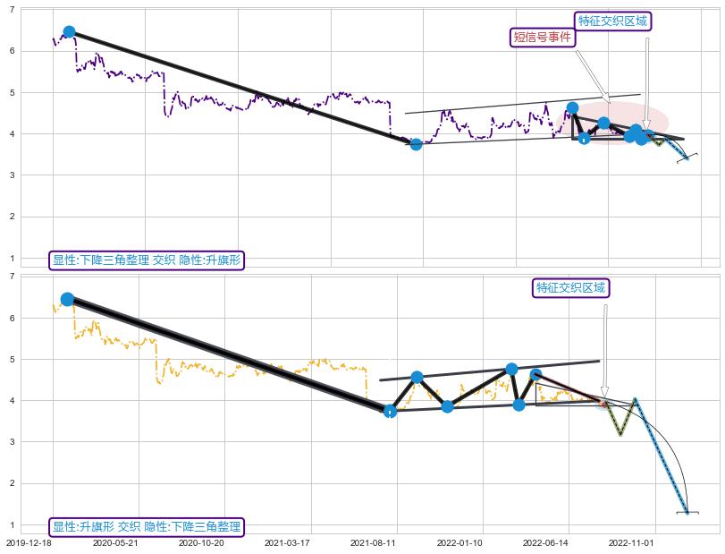 ➢ 下降三角整理:猜想临近关键支撑位突破点 → 临近拐点下跌 → 风险信号 → 大趋势均值回复