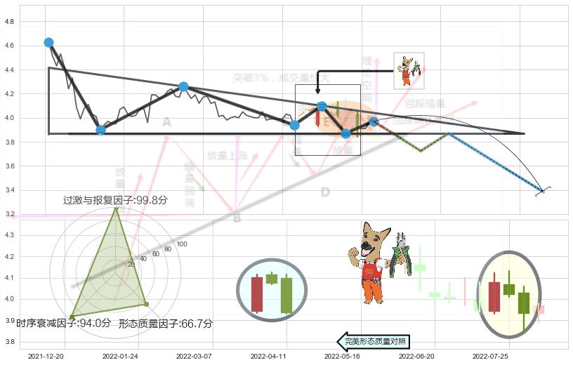 ➣ 【未确认突破,预测即将形成突破】下降三角形整理起点:2022-04-14, 预测突破点:2022-08-19,形态共88交易日