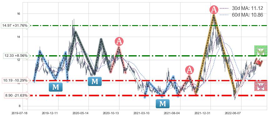 ♘ 支撑价格位10.19,可信任强度82.44%,距离最后交易2022-08-12形成的收盘价格11.36相差 -10.29%