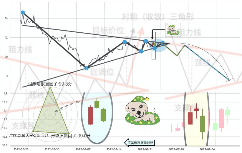 ➣ AI智能: 预测【多空区域上下窄幅震动→价格波动日益狭窄→空方占优】对称三角形中继整理向下突破,预测将在2022-08-11突破颈线, 演变成下降通道