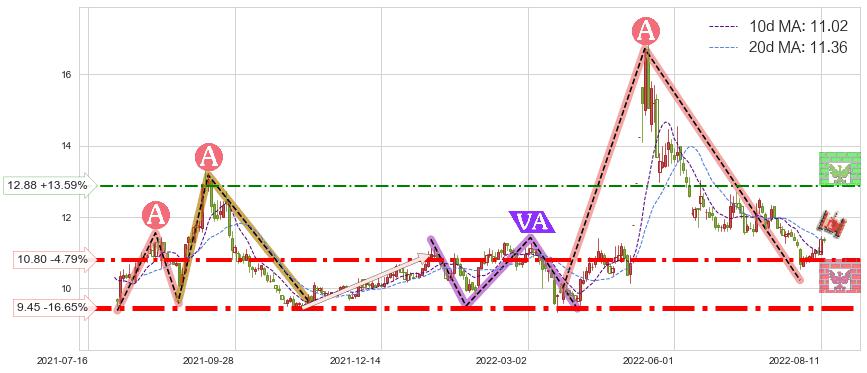 ♘ 支撑价格位10.80,可信任强度72.60%,距离最后交易2022-08-12形成的收盘价格11.34相差 -4.79%