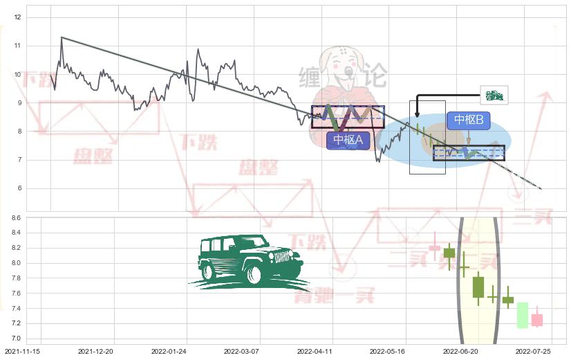 ➢ 【中枢B】:2022-07-27-2022-08-11,中枢由4笔构成,共12交易日, ZG=7.29, ZD=7.27