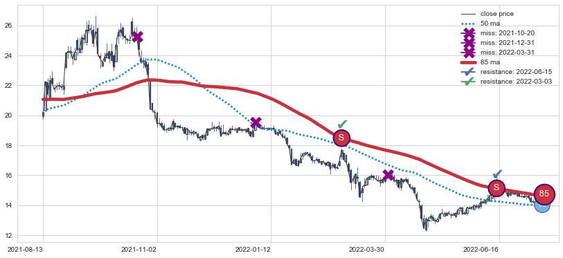 ➣ 70小时均线于(2022-07-05: 14.49)形成【死叉】基于【死叉历史模型】预测死叉后最低波谷价格: 12.35, 死叉后最低价格13.06,尚未达到预测最低波谷价格, 预期继续下跌
